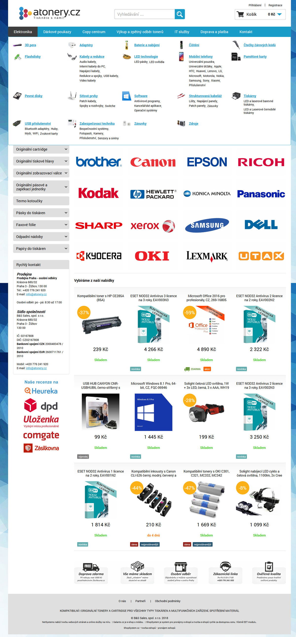 E-shop nabízející tonery a cartridge do tiskáren všech možných značek. E-shop obsahuje několik speciálních funkcí jako napojení na externí dodavatele kombinované s vlastními sklady, modul externích skladů, hlídání různých podstavů zboží, opakované upozorňování klientů na nevyzvednuté objednávky.